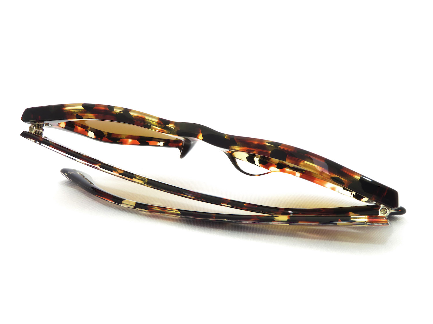 太めで縁感のあるリムデザインや素朴ながらもクールなカッティング、テンプルの中芯には高級感のあるフィリグリー(金銀線細工)を施したパームスプリングス(Palm Springs)柄を採用し緻密なアクセントがそのまま魅力となっています。