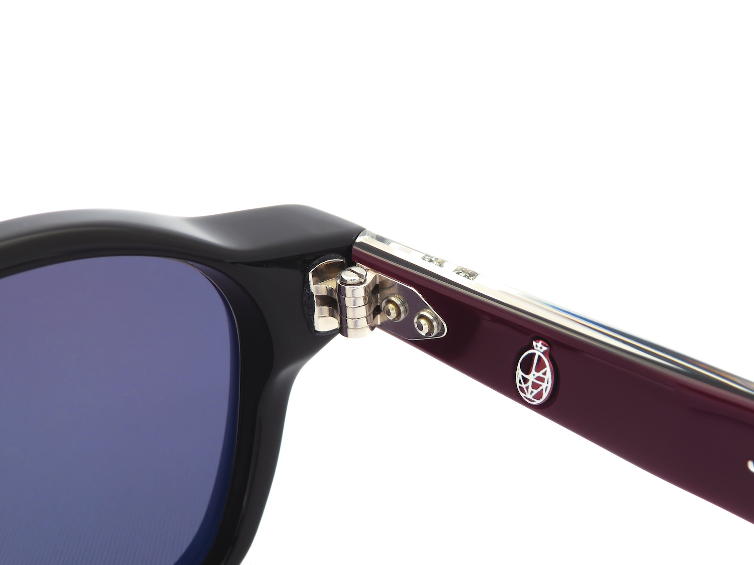 フロントデザインはスッキリしていますが10mm厚のアセテートブロックを用いて丁寧に削り出しが行われ、力強い幅広のテンプルデザインのアクセントが表情を自然に引き締めてくれます。また、智(ヨロイ)にあしらわれた人類文明発展の象徴であるアローマーク(ARROW HEAD)と拍車を模したテンプルの2PINリベット(CUSTUM RIVETS)はさりげなく高級感を演出します。