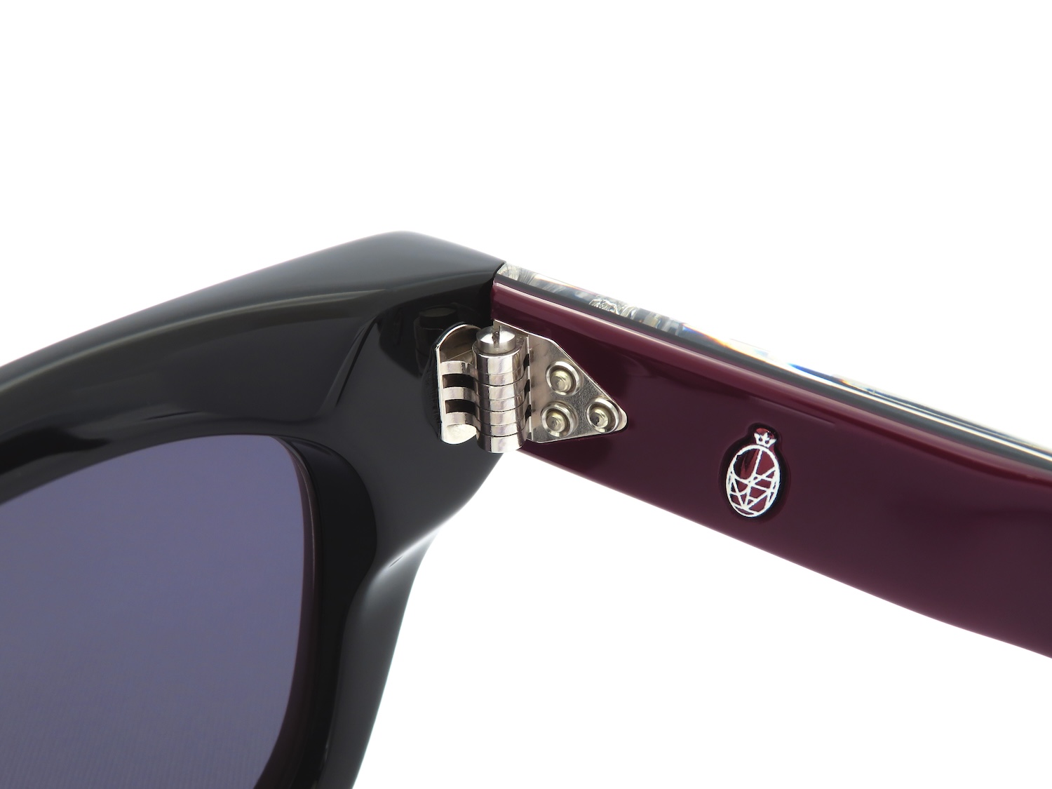10mm厚のアセテートブロック生地を採用して独自のカッティングにより表現された重厚感あふれるスタイルはダイナミックさとクラシカル感が見事に合わさったまさに時代を超えたセッションを愉しむアイテムに仕上がっています。また、智(ヨロイ)には人類文明発展の象徴とされるアローマーク(ARROW HEAD)と拍車を模した三点鋲のリベット(CUSTUM RIVETS)はさりげなく高級感を演出します。