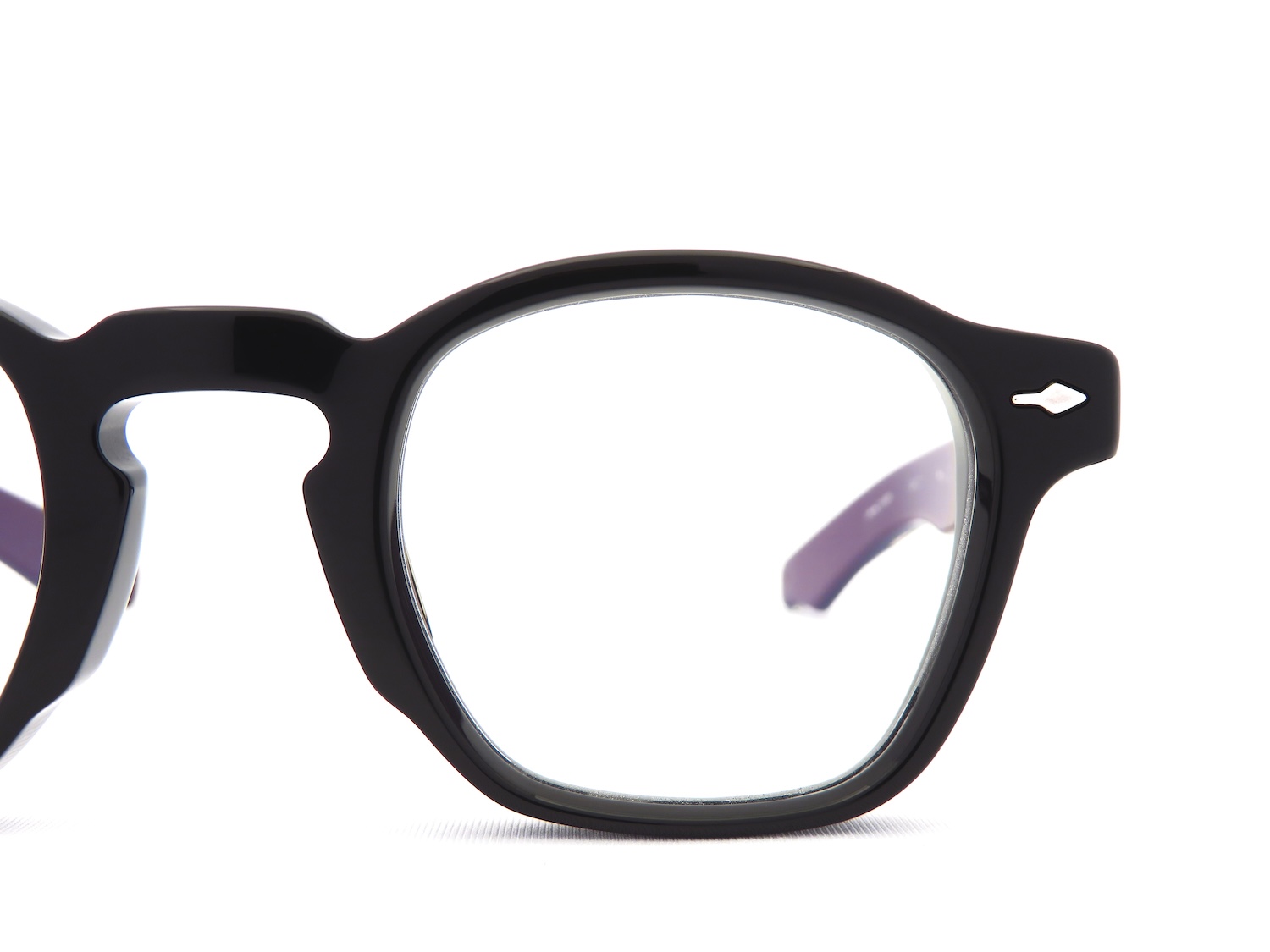 フロントデザインはスッキリしていますが10mm厚のアセテートブロックを用いて丁寧に削り出しが行われ、力強い幅広のテンプルデザインのアクセントが表情を自然に引き締めてくれます。また、智(ヨロイ)にあしらわれた人類文明発展の象徴であるアローマーク(ARROW HEAD)と拍車を模したテンプルの2PINリベット(CUSTUM RIVETS)はさりげなく高級感を演出します。
