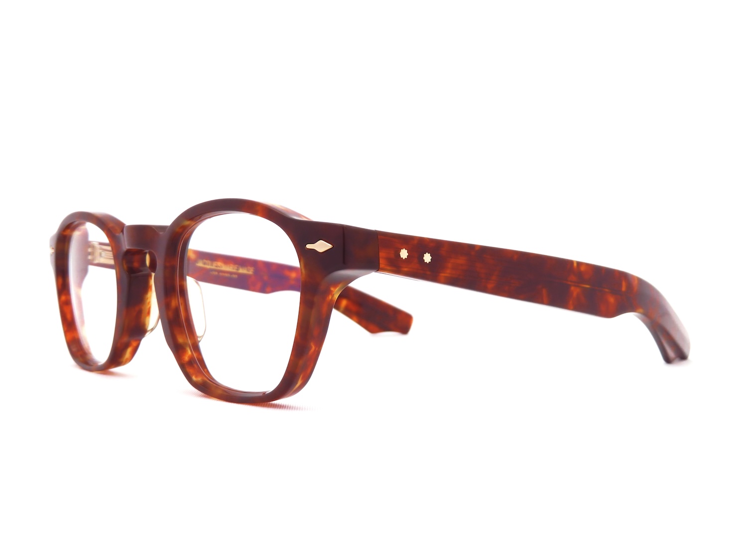 フロントデザインはスッキリしていますが10mm厚のアセテートブロックを用いて丁寧に削り出しが行われ、力強い幅広のテンプルデザインのアクセントが表情を自然に引き締めてくれます。また、智(ヨロイ)にあしらわれた人類文明発展の象徴であるアローマーク(ARROW HEAD)と拍車を模したテンプルの2PINリベット(CUSTUM RIVETS)はさりげなく高級感を演出します。