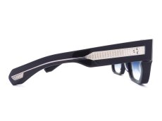 大胆と言って余りあるほどに縦幅を大きくデザインした正方形に迫るウエリントンデザインが特徴でもありJ.M.Mらしい魅力の詰まったアイコニックなモデルです。エッジを強く効かせた全体のフォルムの中でブリッジをさりげなく落とすことでトップ(ブロウ)ラインのストレートさが際立たせているとともに10mm厚のアセテートブロック生地の長所を活かしてどの角度から見ても力強いイメージを放ちます。また、智(ヨロイ)には人類文明発展の象徴とされるアローヘッド(ARROW HEAD)と拍車を模した三点鋲のリベット(CUSTUM RIVETS)はさりげなく高級感を演出します。