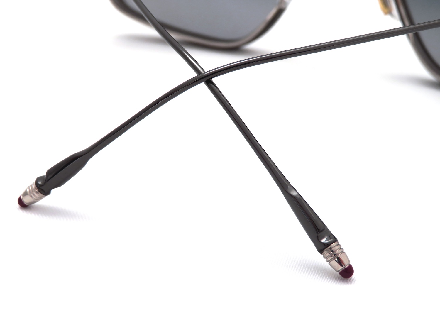1970年代のアヴィエーター(ツーブリッジ)モデルファッション業界において最も勢いのあったスタイルであり当時のスナップにも多くの著名人が愛用しているスタイルです。大胆な大きさにデザインされたティアドロップとレクタングルをミックスさせたシェイプラインはラグシュアリーさを放ちながらも強度と柔軟性に優れたフルβ(ベータ)チタンのフレームは4mm厚のフロントリムやアール・デコの様式美を兼ね備えたブロウバー、モノブロックヒンジによる構成で兼ね備えた珠玉のアイテムです。また、J.M.Mのシグネチャーの1つでもあるバーガンディーのエナメルをほどこしたテンプルエンドチップなど細部に至るまで強いこだわりを詰め込んでいます。