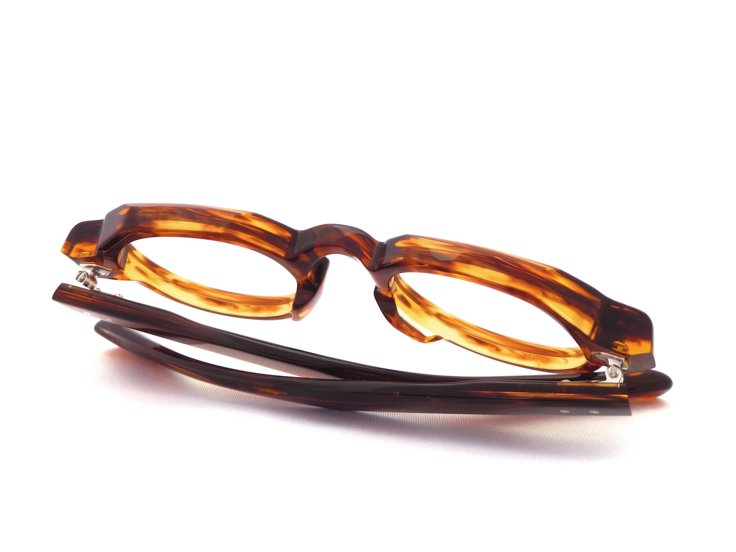 当時のヨーロピアンスタイルを踏襲するようなミニマルなスタイルは小さめの智(ヨロイ)や大きめのキーホールブリッジを備え、特注の10mm厚アセテートにブロウのベベルカットを始めパント型のリムにエッジを強調させたカッティングを随所にほどこすことで存在感があるアイテムに仕上がっています。