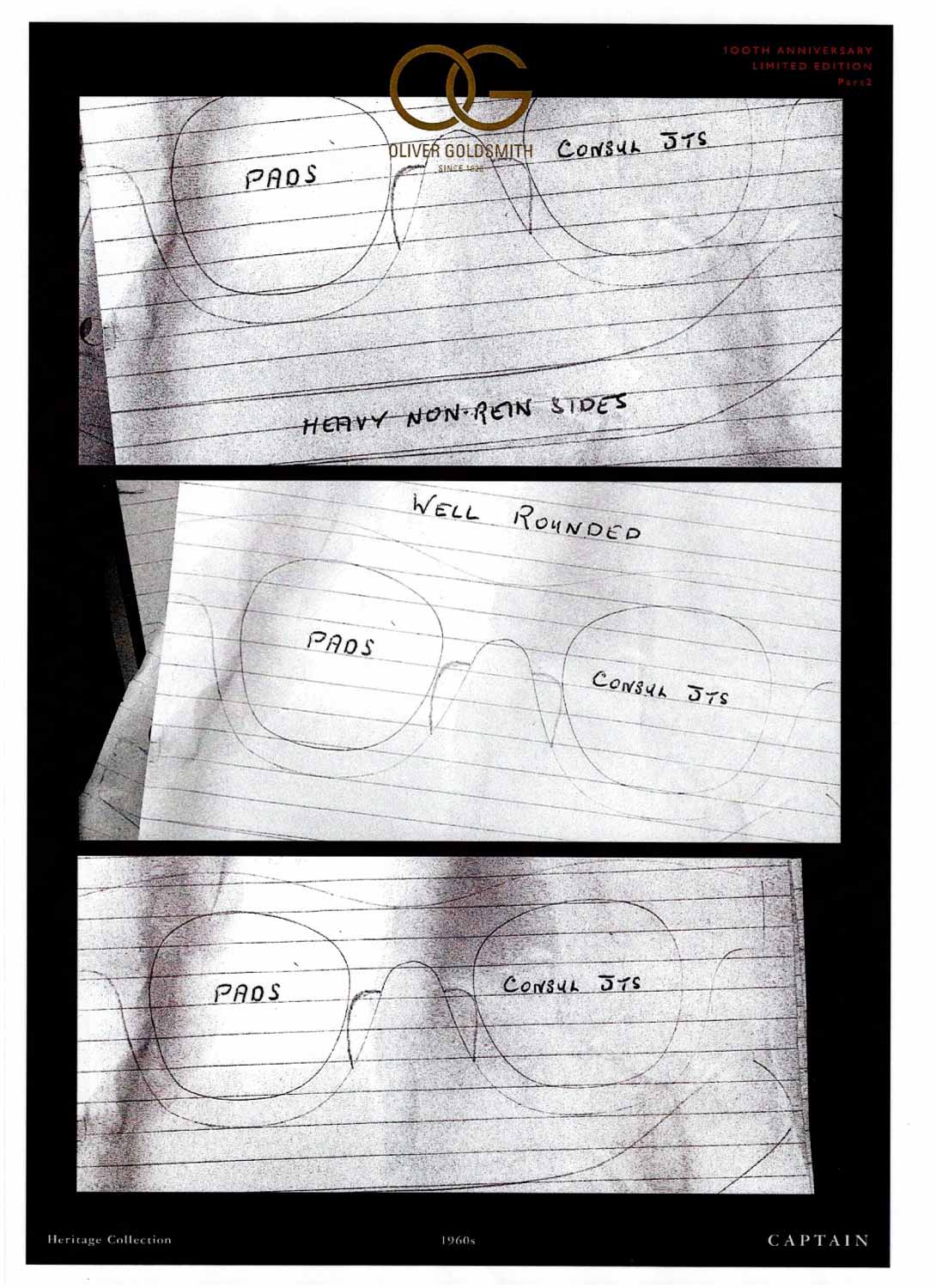 本モデルの初復刻にあたり2代目のチャールズ・オリバー・ゴールドスミス氏による手描き設計図しか残されていなかったものの3代目のアンドリュー氏のわずかな記憶を頼りに数年を掛けて忠実な再現に至ったアイテムです。1960年代に完成したマスターピースである『CONSUL』や『VICE CONSUL』よりも以前に製造されたプロダクトのため現代のトレンドに一切迎合しない本格的なブリティッシュヴィンテージが楽しめます。