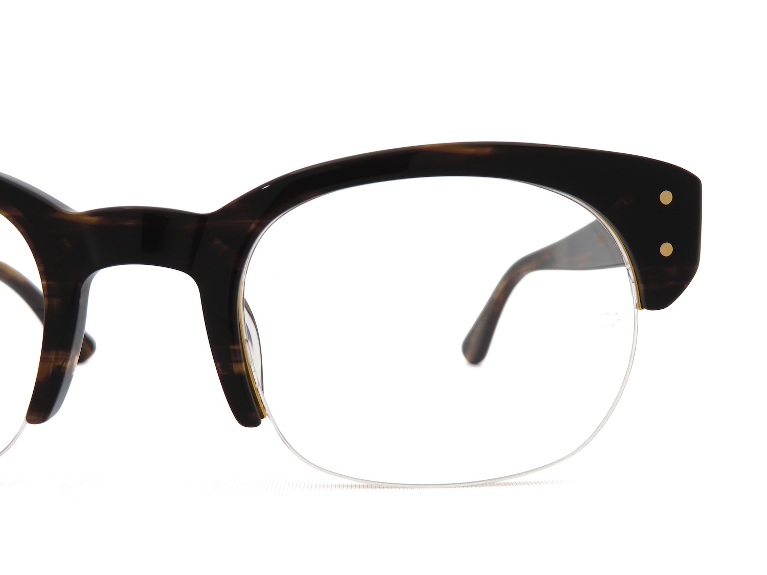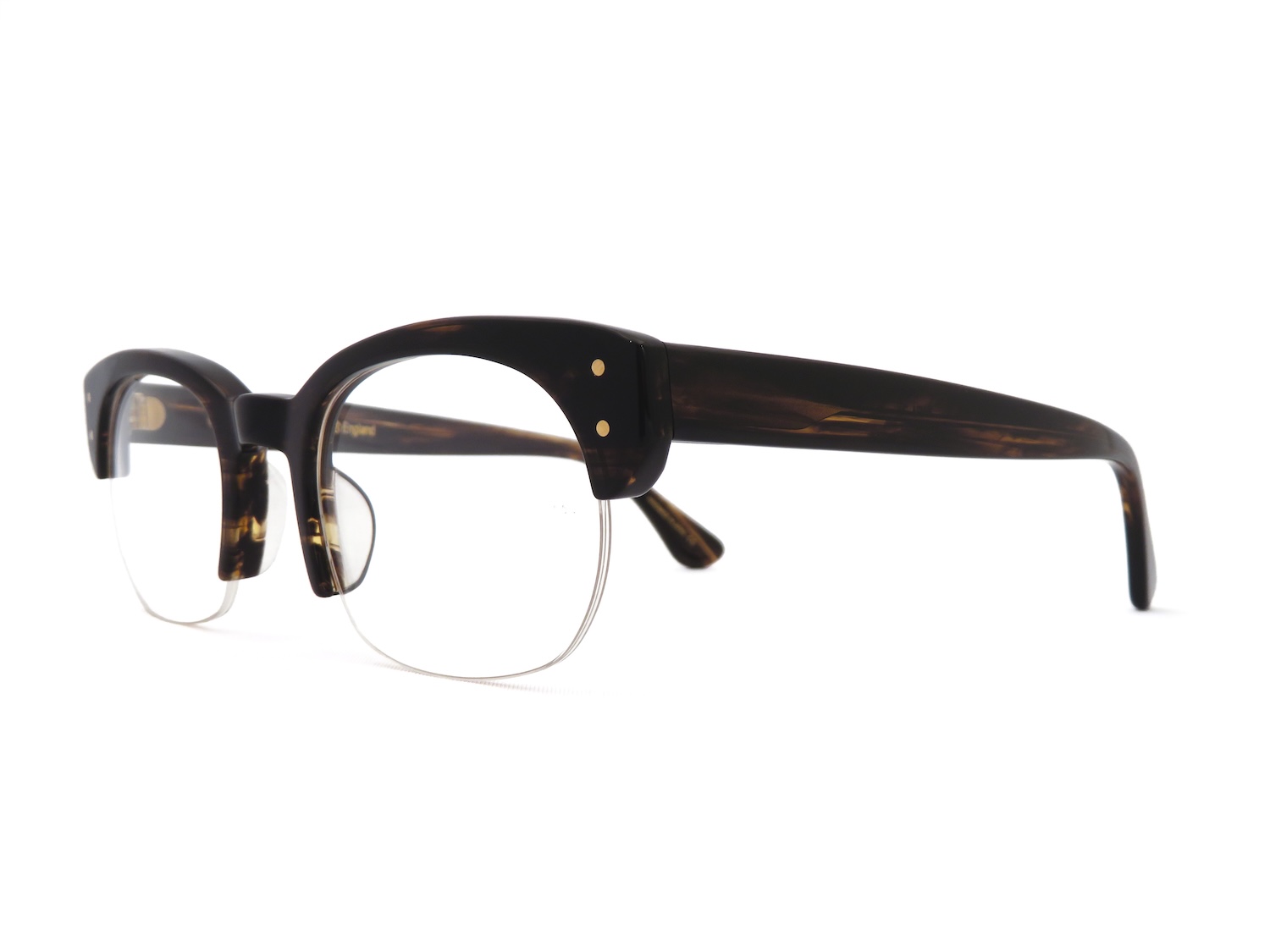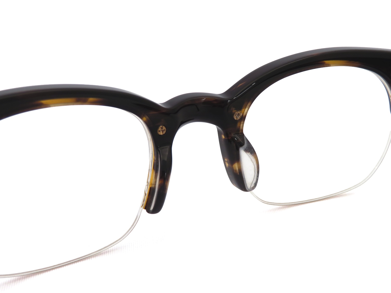 レンズのシェイプはボストンウエリントンと呼称する顔馴染みが良く柔和なイメージとコートノーズパットが一体型となっているプラスティックブロウに2PINのカシメが備わったデザインはボリュームのあるコレクションが多めのOGにおいてはシンプルさと軽量感が特徴のアイテムです。