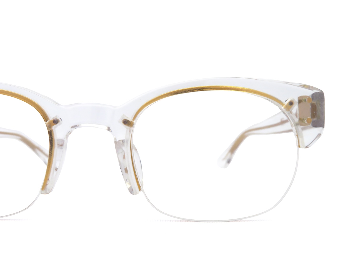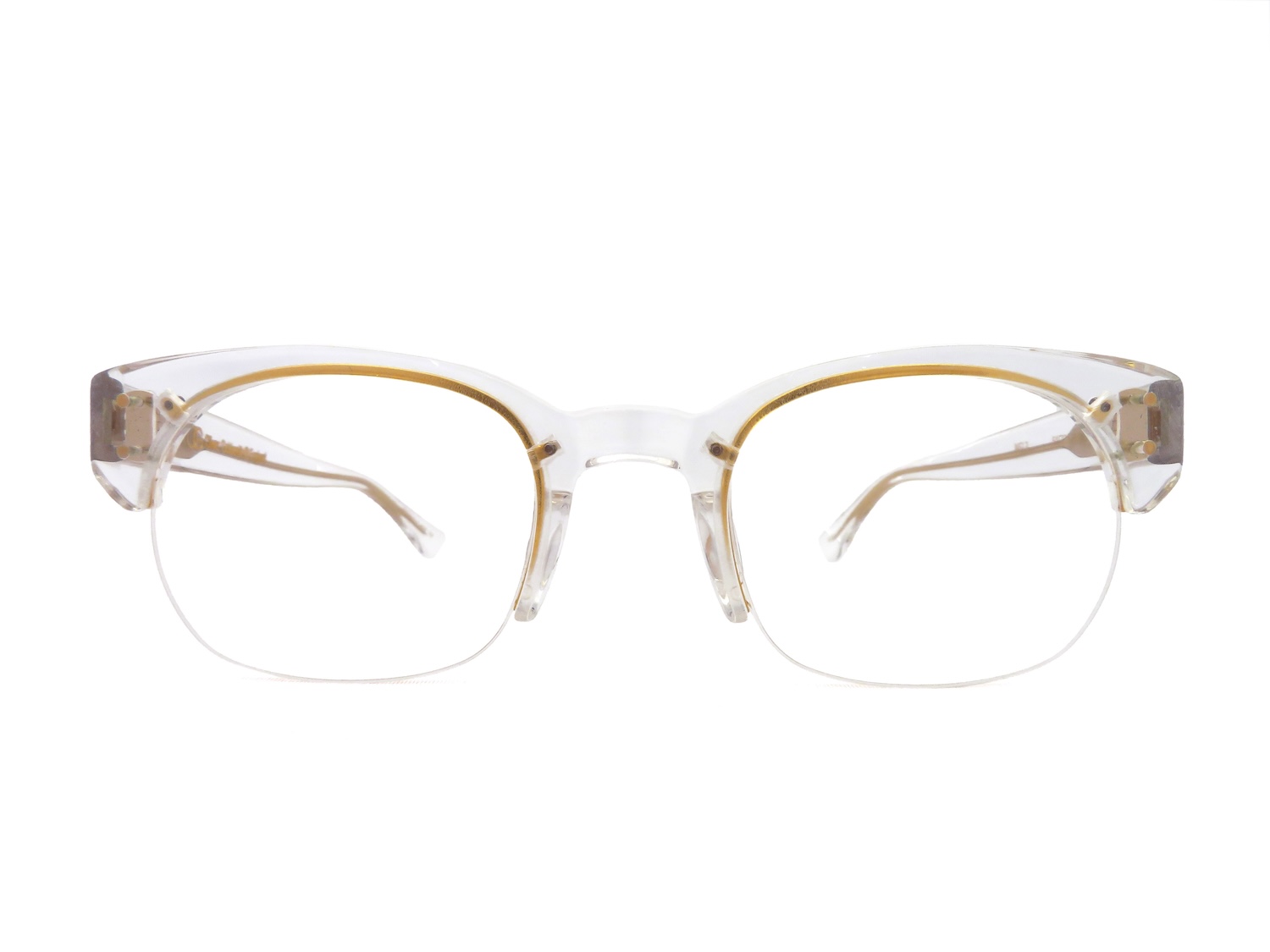 レンズのシェイプはボストンウエリントンと呼称する顔馴染みが良く柔和なイメージとコートノーズパットが一体型となっているプラスティックブロウに2PINのカシメが備わったデザインはボリュームのあるコレクションが多めのOGにおいてはシンプルさと軽量感が特徴のアイテムです。