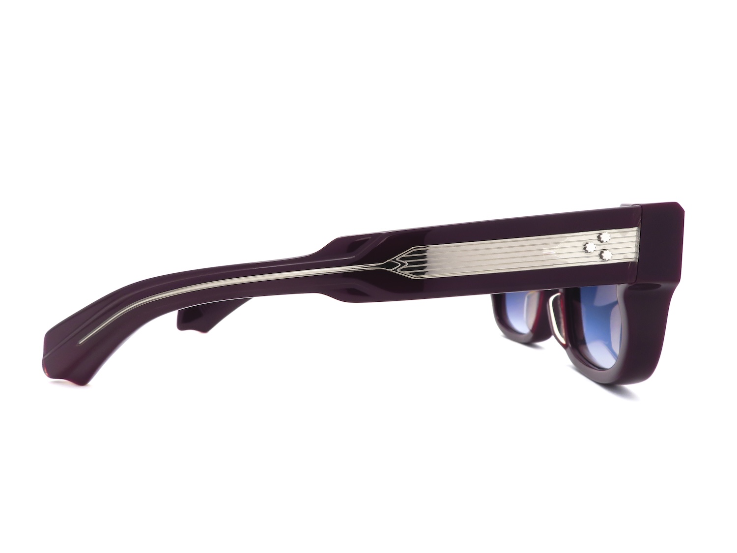 また、J.M.Mアイウェアには欠かせない人類文明発展の象徴とされるアローマーク(ARROW HEAD)を智(ヨロイ)に配置し、拍車を模した三点鋲のリベット(CUSTUM RIVETS)、アール・デコ調のヘアラインをあしらった芯金(WIRE CORE)によってさりげない高級感を演出します。