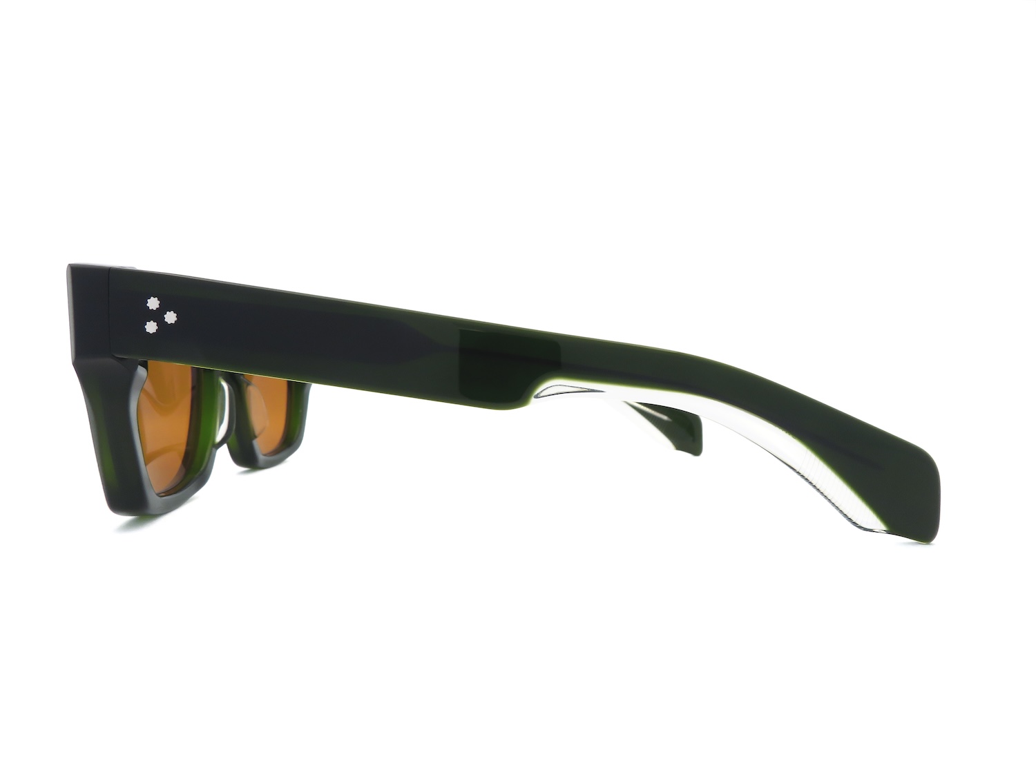 クラシカルな印象とフォックスのようにつり上がったブロウデザインが特徴のウエリントンモデルで、J.M.M特注の10mm厚アセテート生地にカッティングをほどこすことでフォルム全体のクラシックさにモダンな印象を加えてアップデートしています。また、智(ヨロイ)にあしらわれた人類文明発展の象徴である矢じり型のカシメピン(ARROW HEAD)と拍車を模したテンプルの三点鋲リベット(CUSTUM RIVETS)、そしてアール•デコ建築から着想を得た芯金(WIRE CORE)のエングレービングによってさりげなく高級感を演出します。