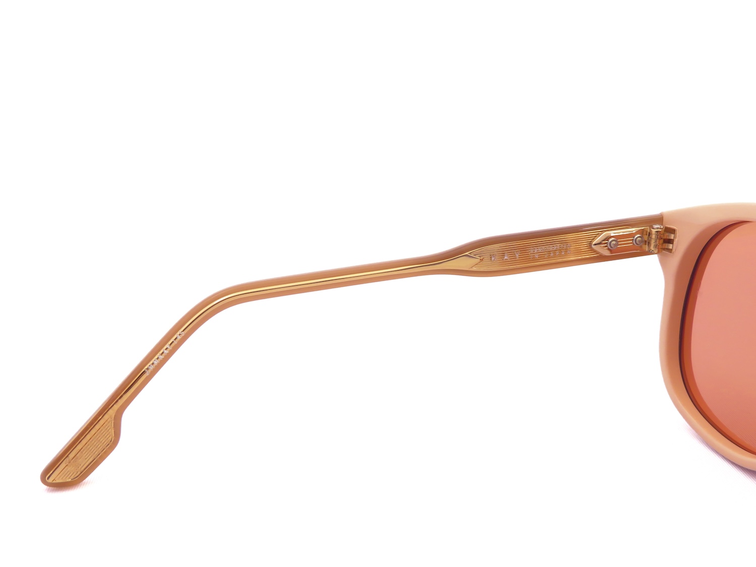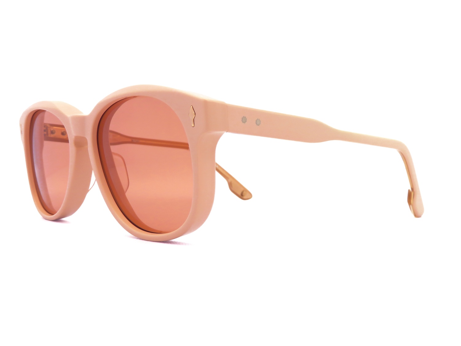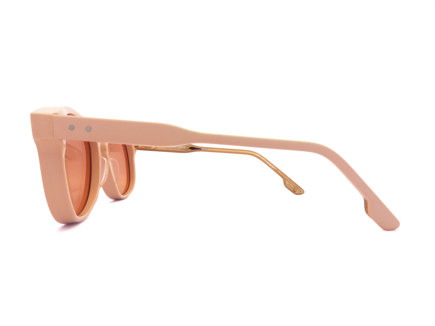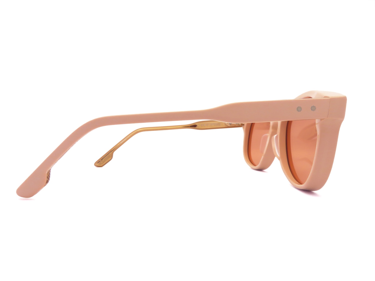 特注の10mm厚アセテート生地はエッジ感を残したカッティングにすることで現代のモードファッションにも適合させる巧みなスタイルを実現しています。また、人類文明発展の象徴とされるアローマーク(ARROW HEAD)とテンプルの拍車を摸したカスタムリベット二点鋲によってさりげなく且つ力強く高級感を表現しています。