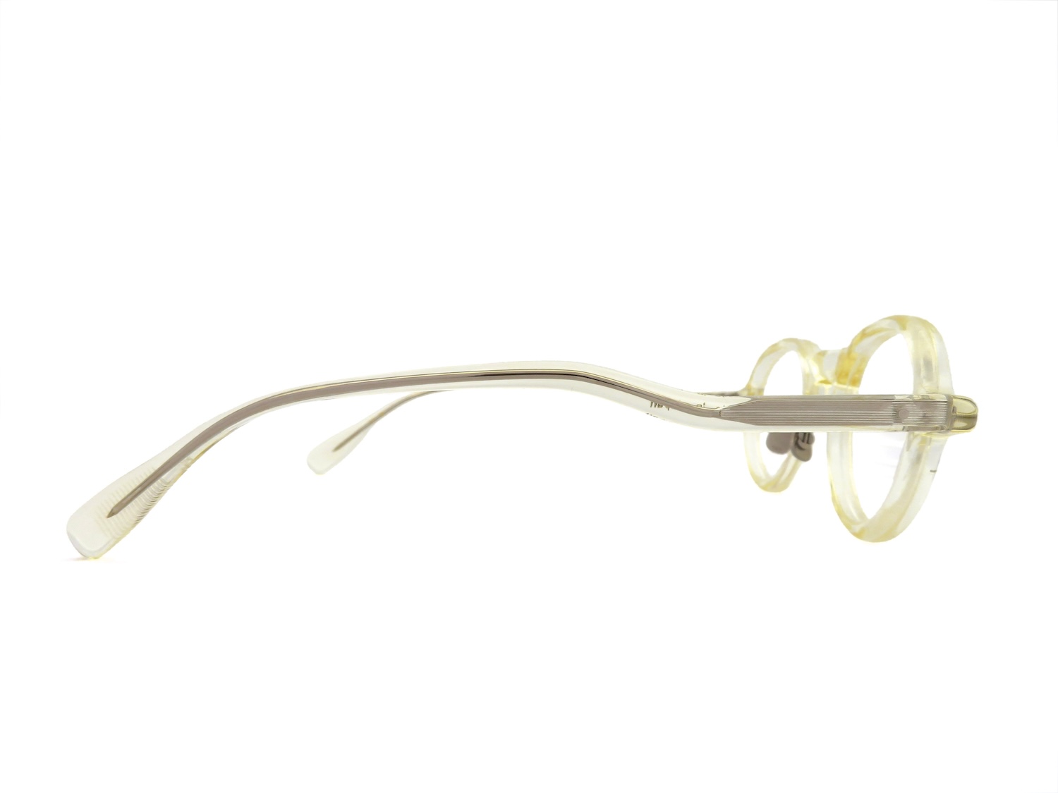 2023SS発表モデルで合口部からしのみにかけて徐々に位置が上がっていく アンダーテンプルという特徴的な意匠で構成されている「347」のスタイルを踏襲しつつレンズシェイプは7285のマスターピース『338』の馴染みやすいボストンシェイプを合わせ、高いブリッジとラウンドフレームさながらの低い位置に智(ヨロイ)を持ってくるモダンでファッショナブルなイメージが魅力的です。