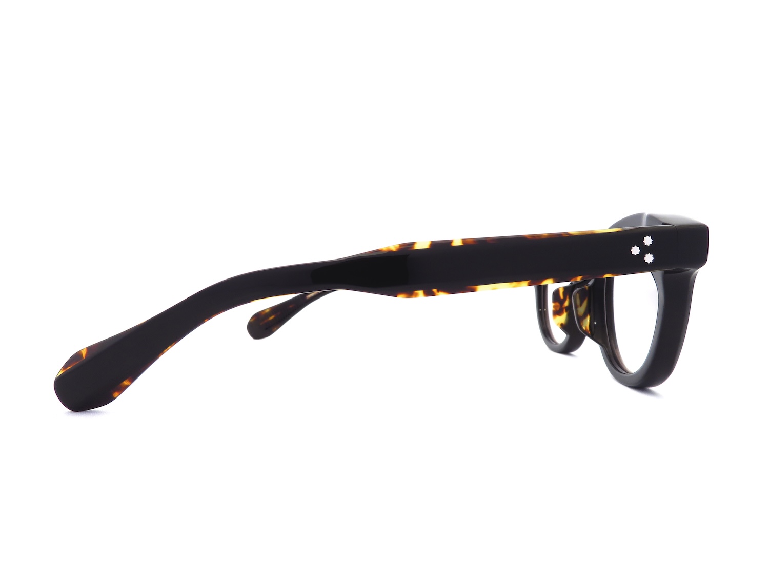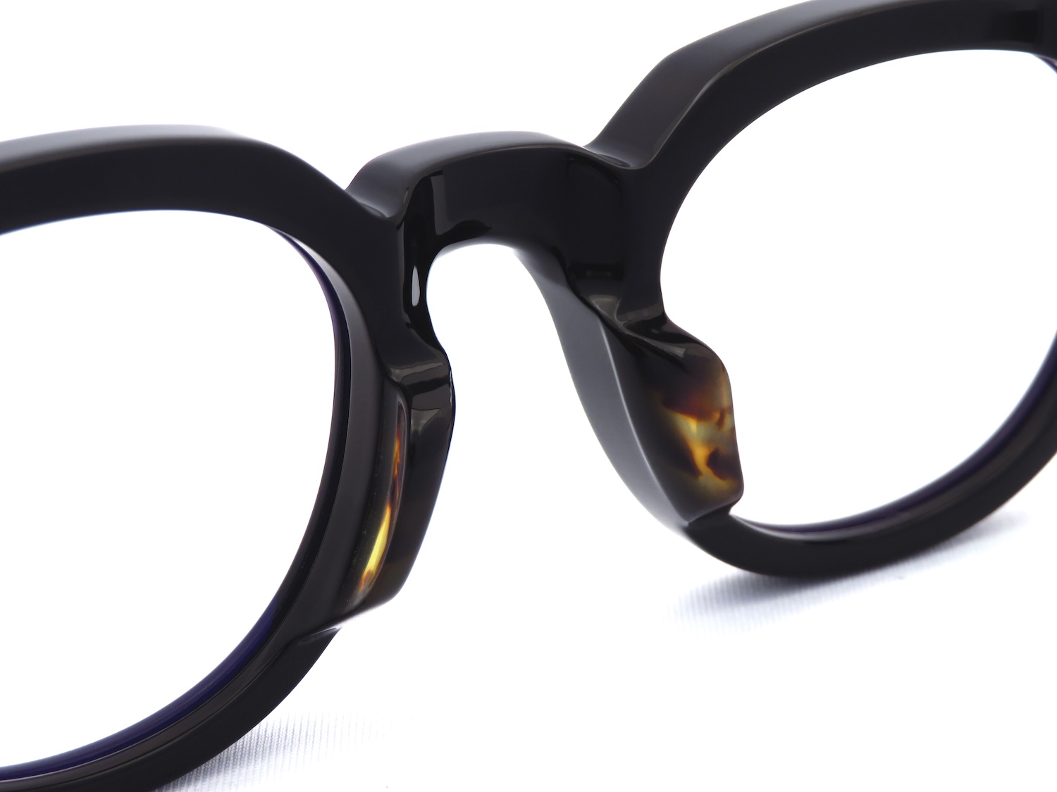 1970年代の日本映画の持つ気品と力強さからインスパイアしたと語られるフロントデザインはブリッジ位置を低めセットし、直線と曲線を巧みに合わせた大胆なブロウラインと顔馴染みの良いやや大きめのボストンウエリントン(丸型と逆台形のミックス)のレンズシェイプという王道なスタイルをベースにしつつ、J.M.M特注の10mmアセテート生地の多面的なカッティングによって放つ存在感が非常に魅力的なモデルです。
