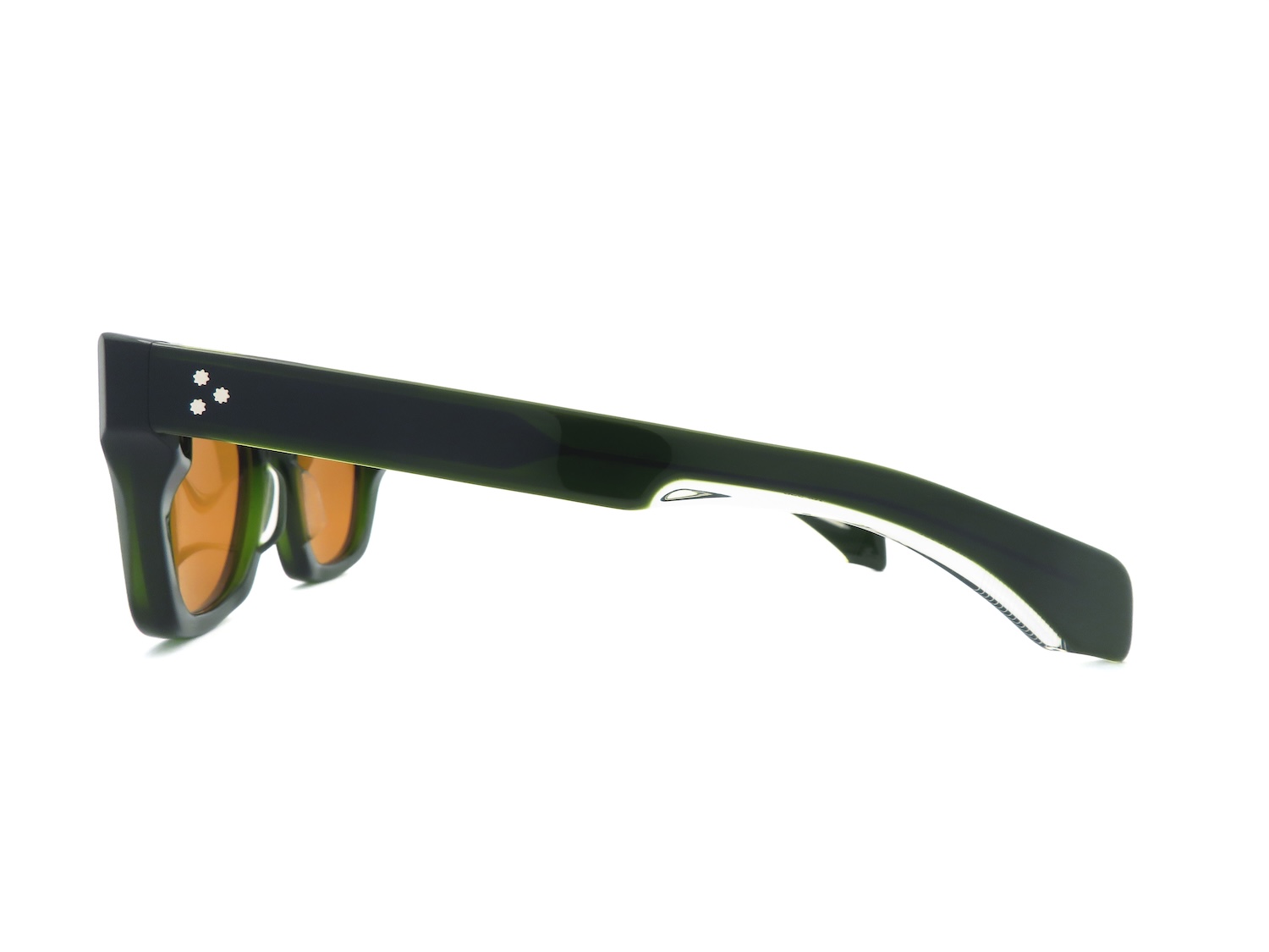 クラシカルな印象とフォックスのようにつり上がったブロウデザインが特徴のウエリントンモデルで、J.M.M特注の10mm厚アセテート生地にカッティングをほどこすことでフォルム全体のクラシックさにモダンな印象を加えてアップデートしています。また、智(ヨロイ)にあしらわれた人類文明発展の象徴である矢じり型のカシメピン(ARROW HEAD)と拍車を模したテンプルの三点鋲リベット(CUSTUM RIVETS)、そしてアール•デコ建築から着想を得た芯金(WIRE CORE)のエングレービングによってさりげなく高級感を演出します。