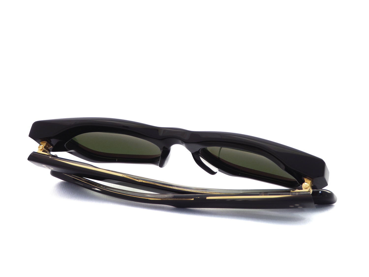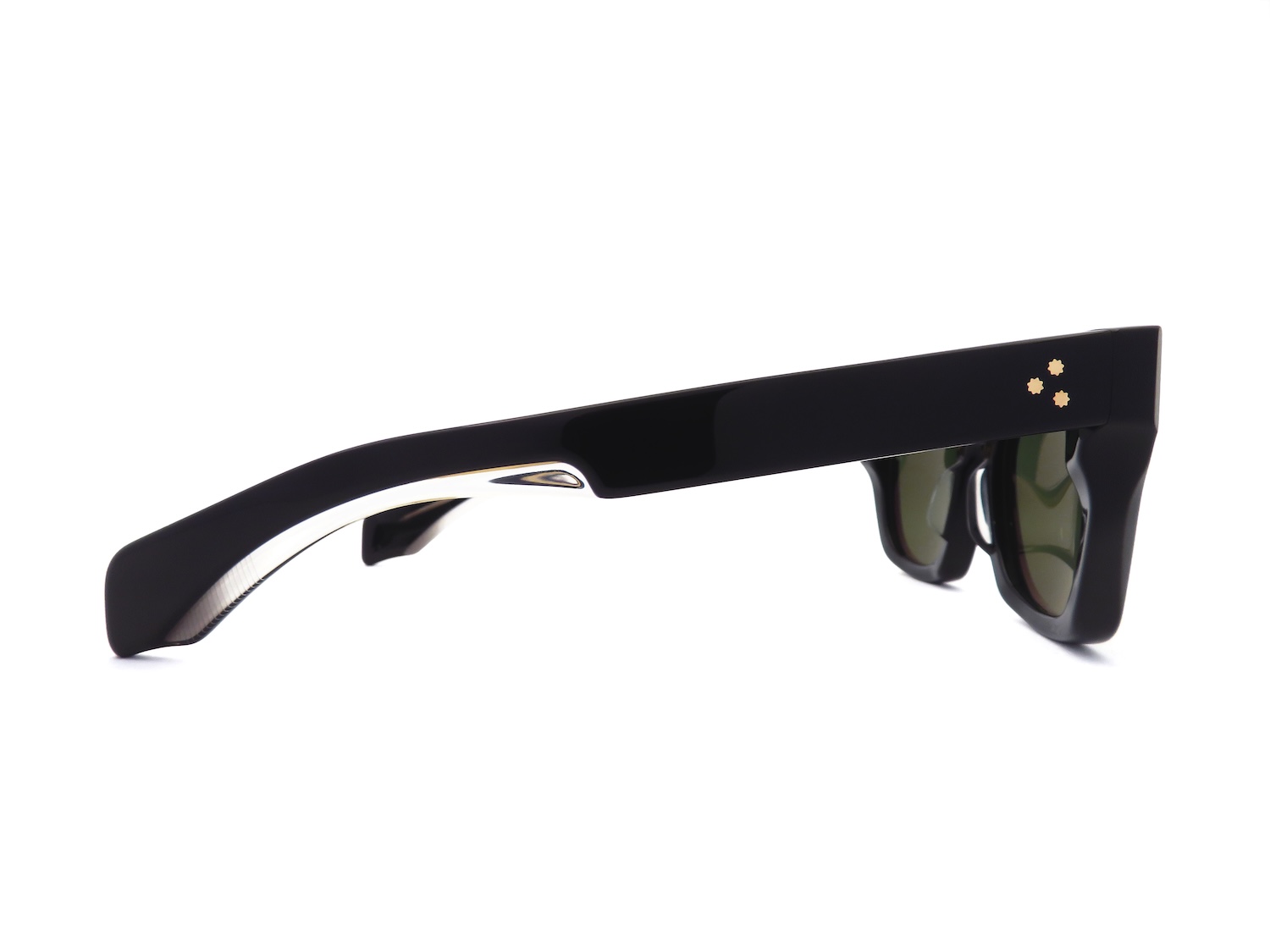クラシカルな印象とフォックスのようにつり上がったブロウデザインが特徴のウエリントンモデルで、J.M.M特注の10mm厚アセテート生地にカッティングをほどこすことでフォルム全体のクラシックさにモダンな印象を加えてアップデートしています。また、智(ヨロイ)にあしらわれた人類文明発展の象徴である矢じり型のカシメピン(ARROW HEAD)と拍車を模したテンプルの三点鋲リベット(CUSTUM RIVETS)、そしてアール•デコ建築から着想を得た芯金(WIRE CORE)のエングレービングによってさりげなく高級感を演出します。