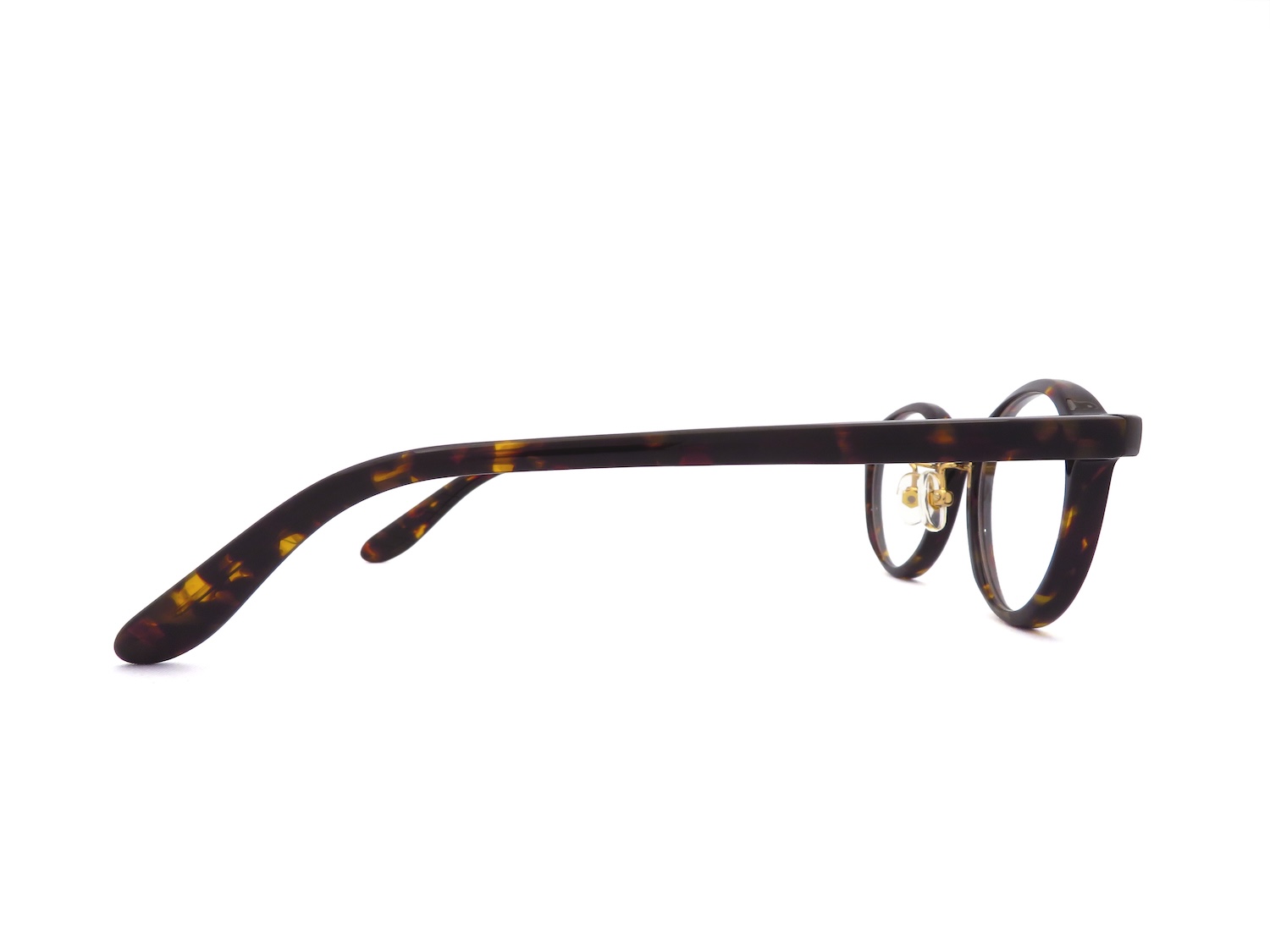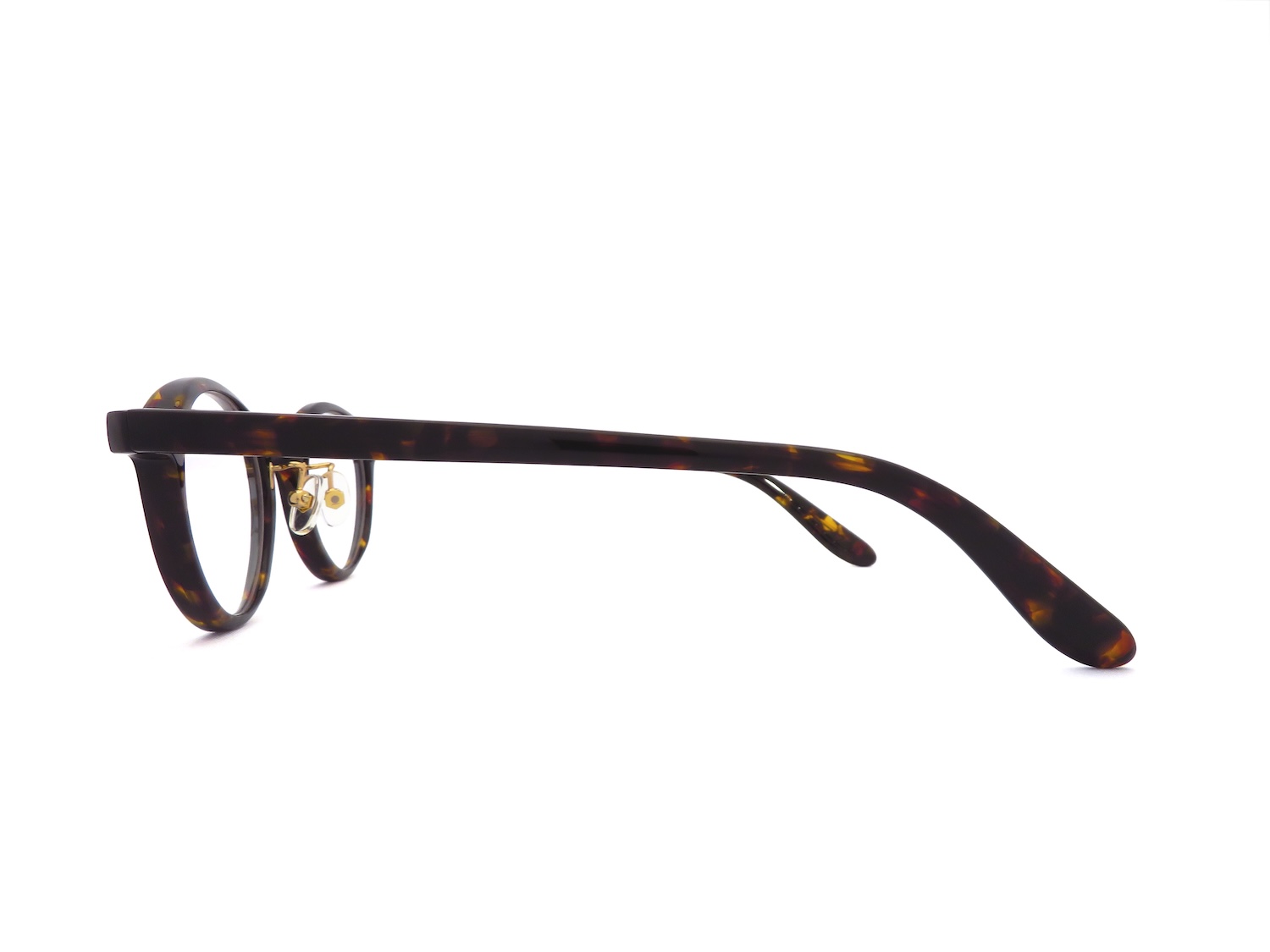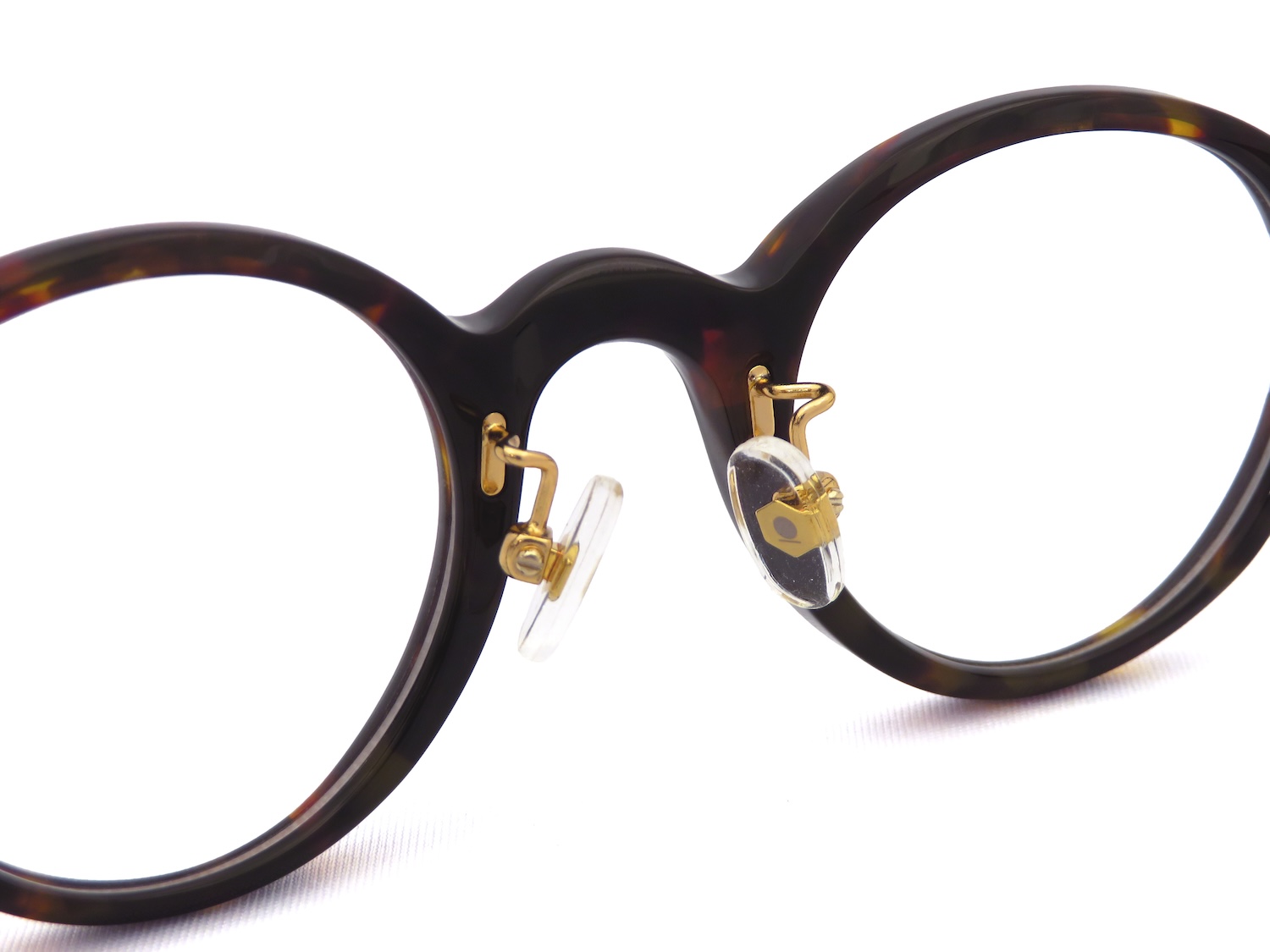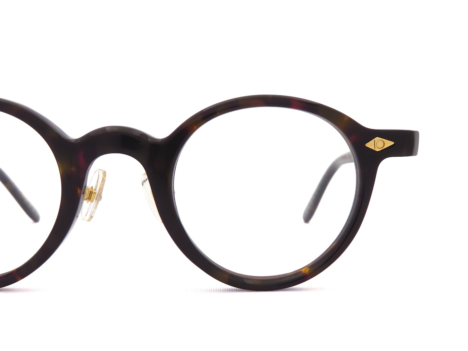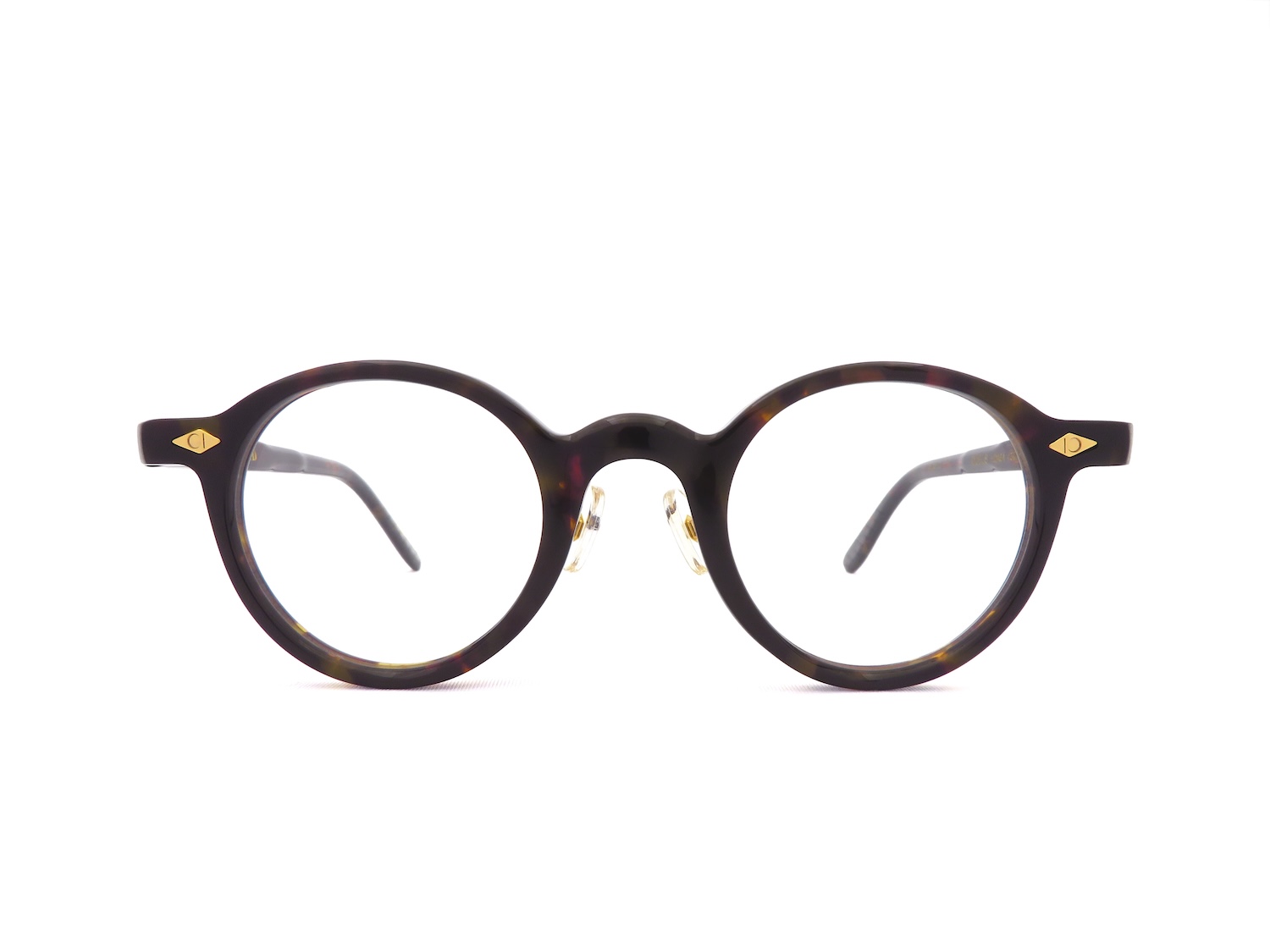ヴィンテージフレームが持つようなホーンリム(角のように突き出したヨロイのデザイン)を備えて力強さを備え、その絶妙なサイズ感や華奢なイメージからは意外に感じるほど型崩れの起きにくいしっかりとしたつくりになっている他、ヨロイに埋め込まれたダイヤモンド型のブランドオリジナルのカシメ飾りもさりげなく目元のアクセントとして高級感を演出します。